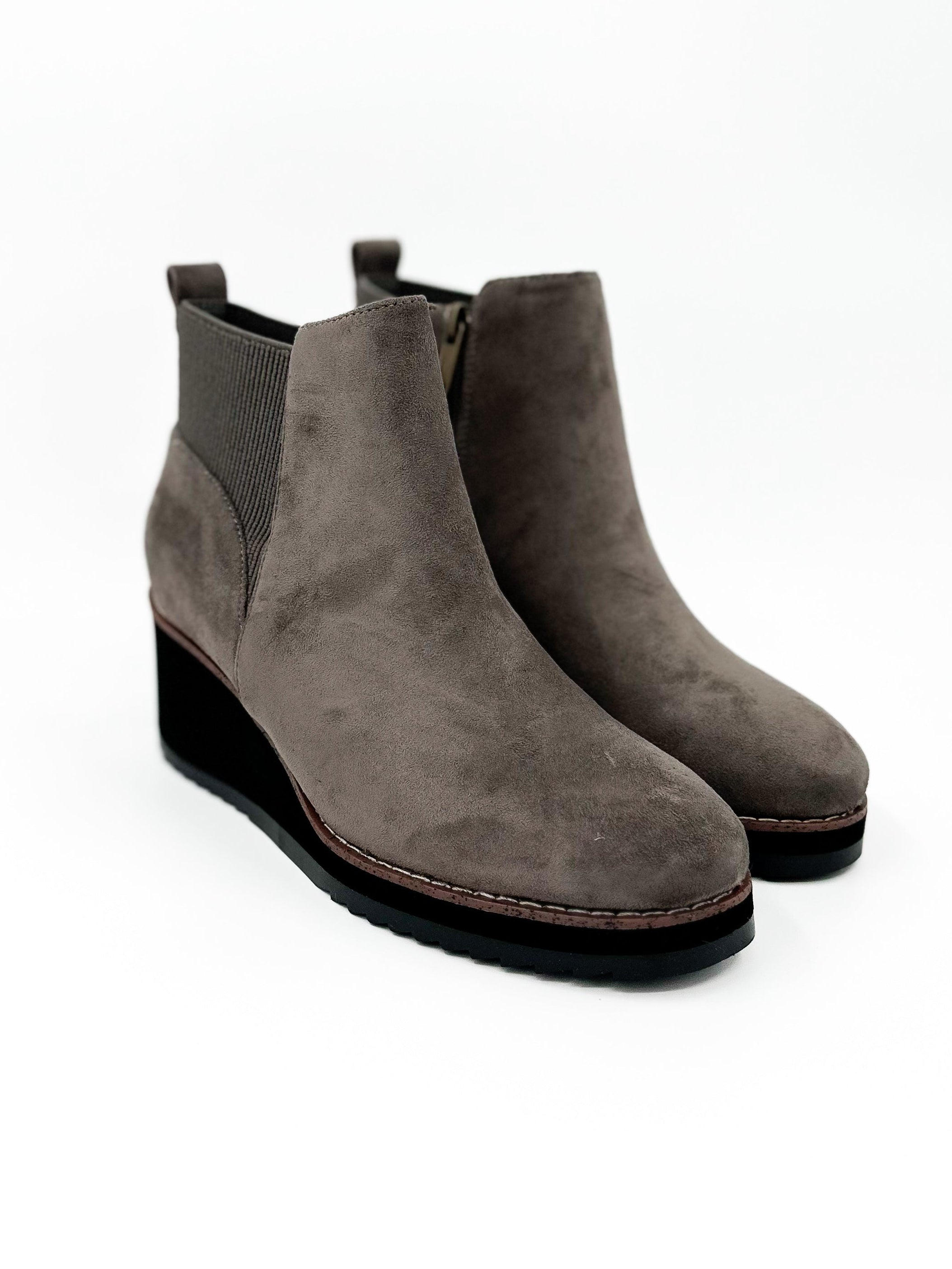 Step out in style with Corkys Let's Get Lost Faux Suede Wedge Booties, available in camel, black, tan, or grey. Featuring a convenient side zip, these booties effortlessly blend comfort and flair. Perfect for dressing up or keeping it casual, they add a playful touch to any outfit.