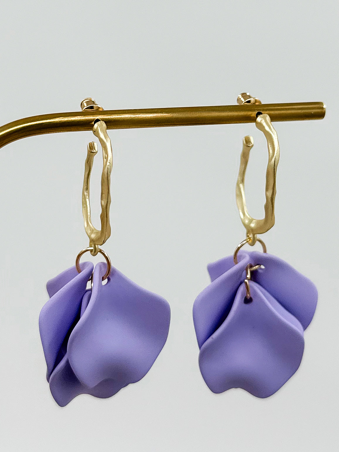 Add a touch of whimsy to your outfit with our Falling Petals Gold Drop Earrings, available in 2 colors - purple and teal. These gold hoops are adorned with delicate dangling petals, making them the perfect accessory for a playful and fun look.