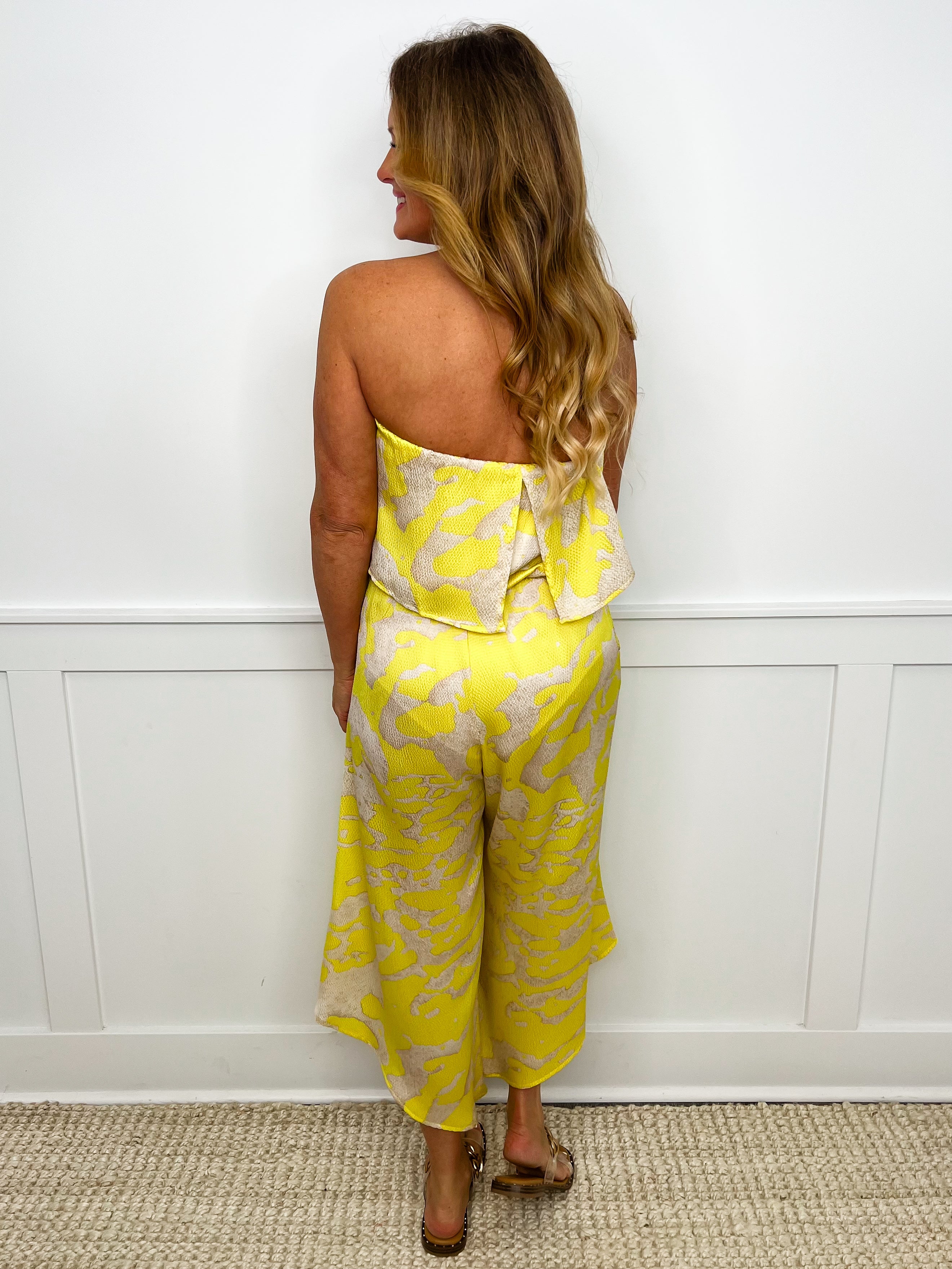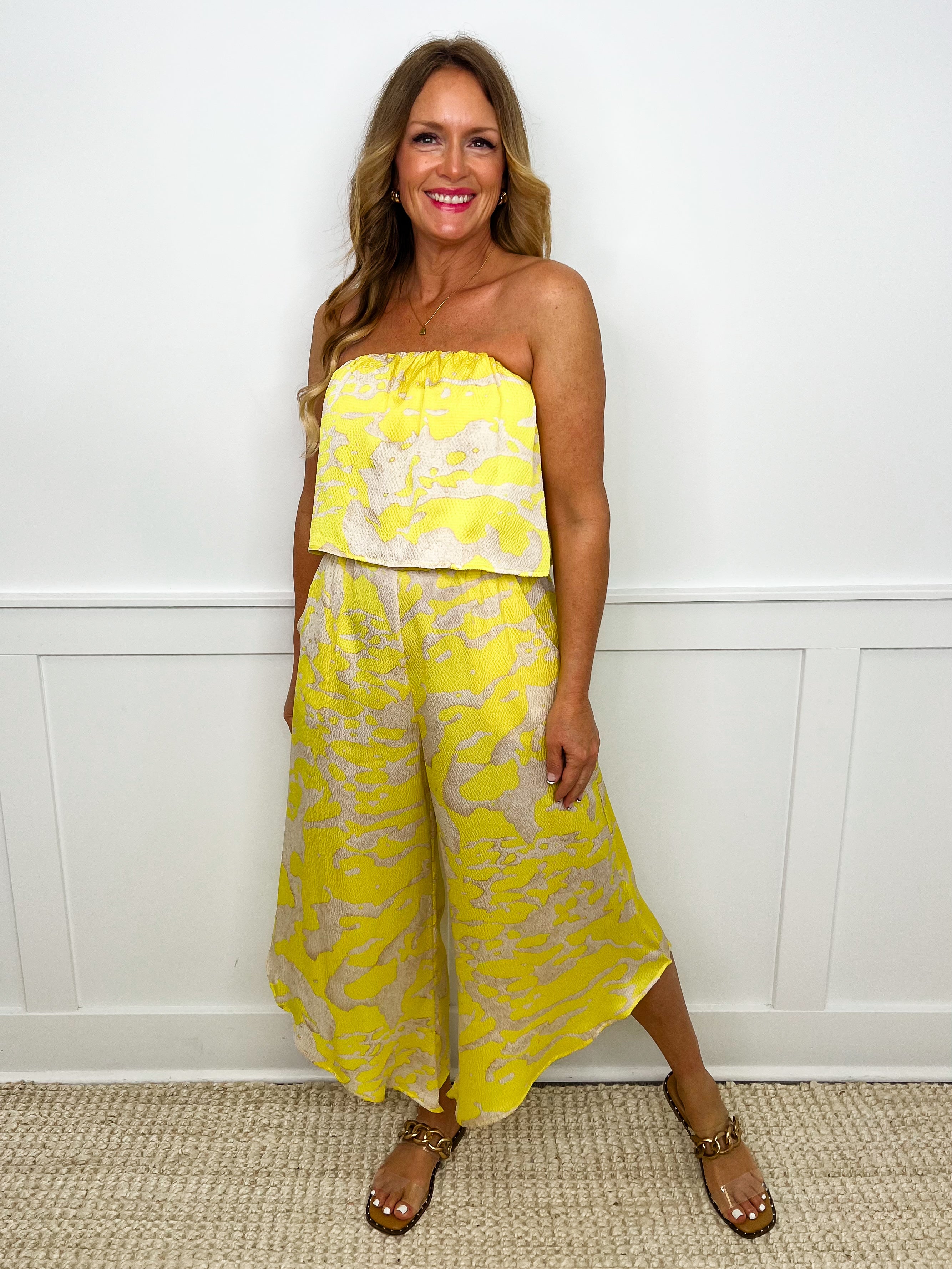 Saunter into style with our Go On Girl Jumpsuit! This lightweight, strapless stunner features an eye-catching textured snake skin pattern in vibrant yellow and sand tones. The playful slanted hem adds just the right amount of drama to your look. Perfect for turning heads at your next summer soirée or vacation getaway!