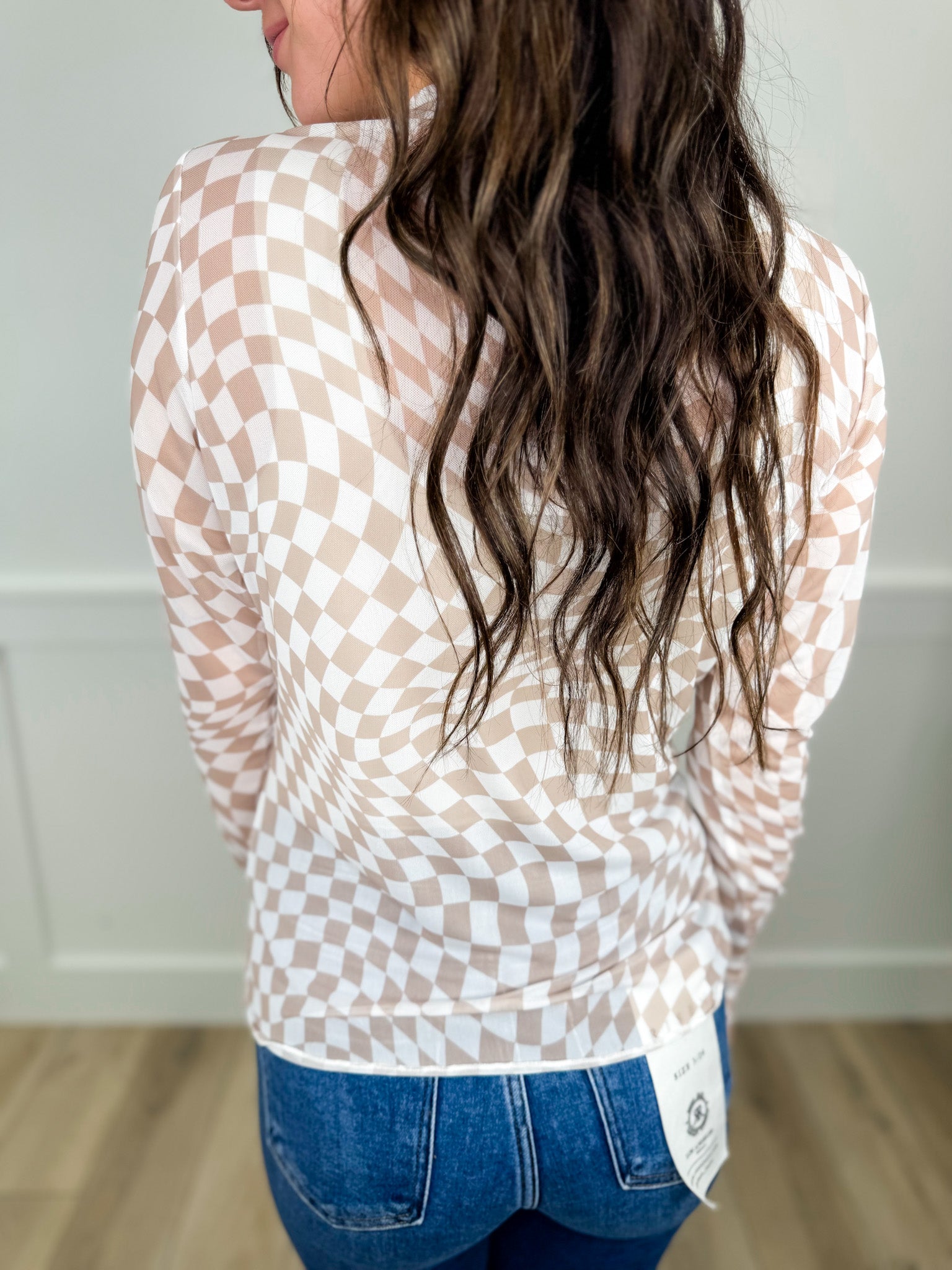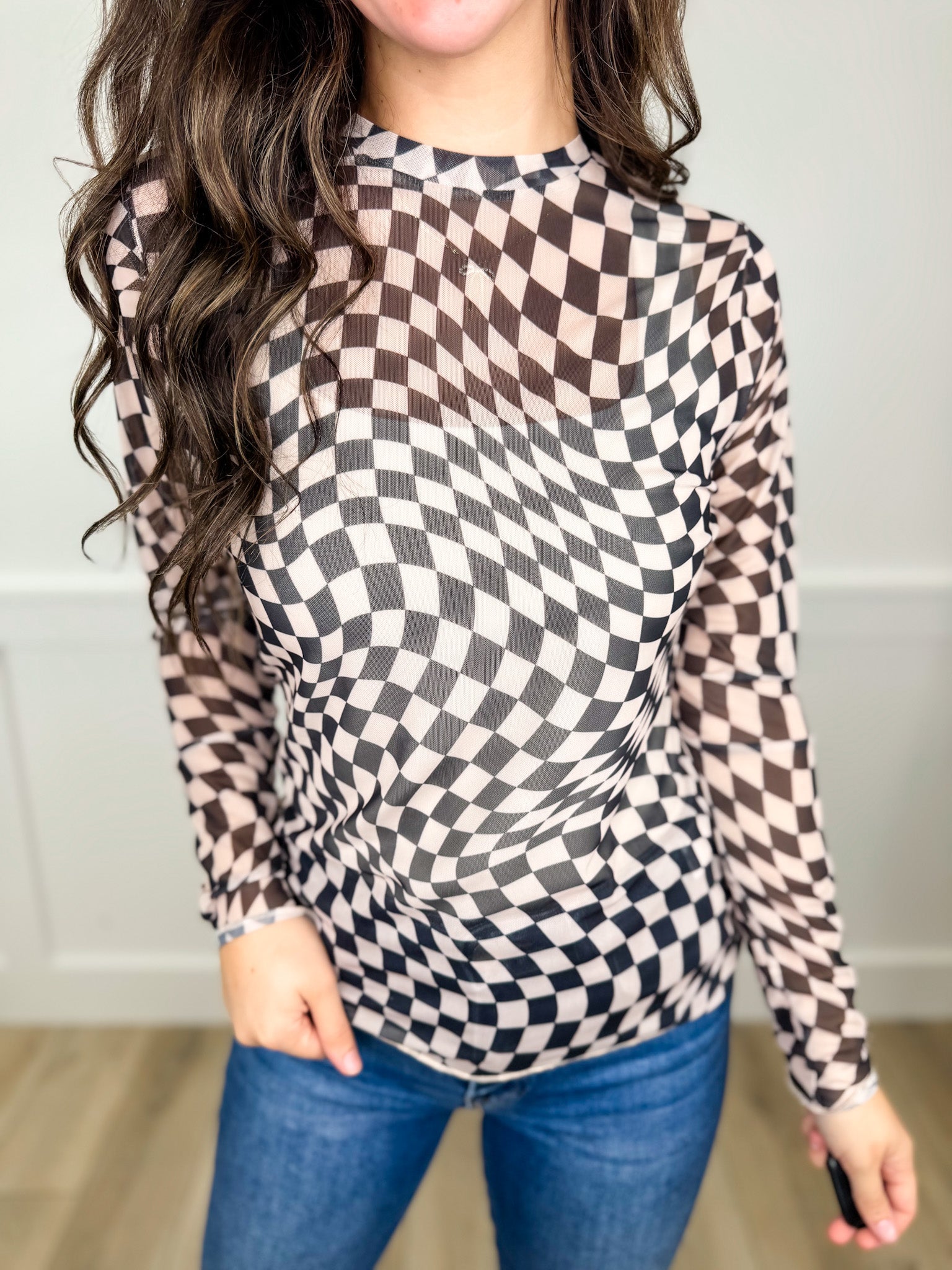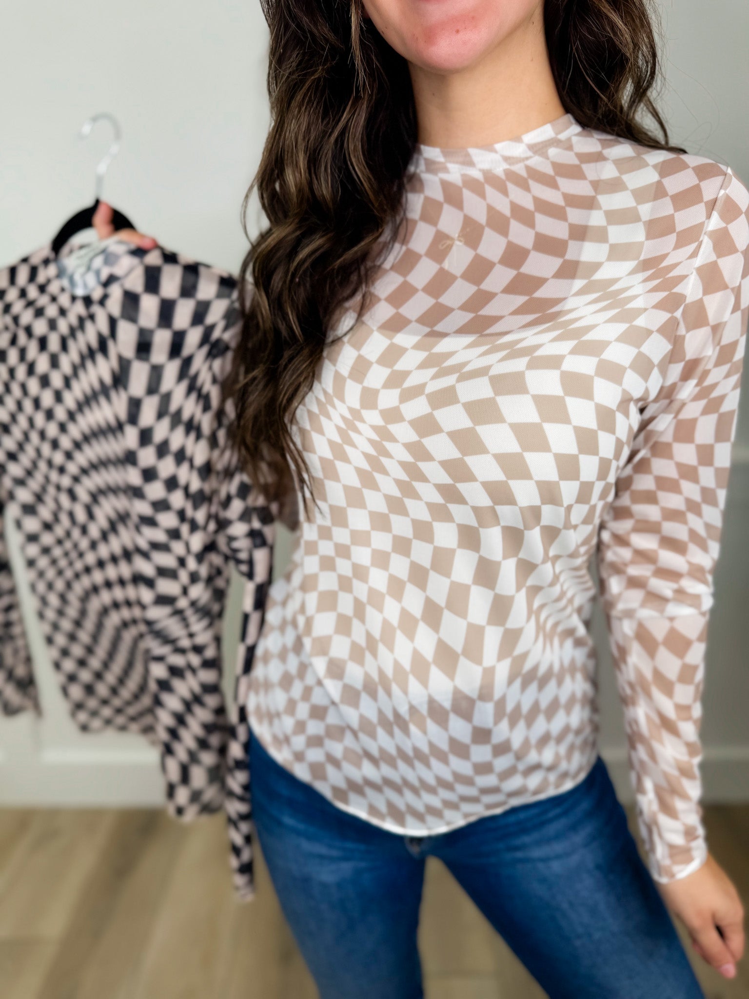 Elevate your style with the Hold Onto That Feeling Sheer Mesh Long Sleeve Avery Mae Top, featuring a trendy wavy checkered pattern in chic neutral tones. This playful, lightweight top adds a modern twist to any outfit, perfect for layering or wearing solo to turn heads effortlessly. Available in two versatile colors to match your mood and wardrobe.