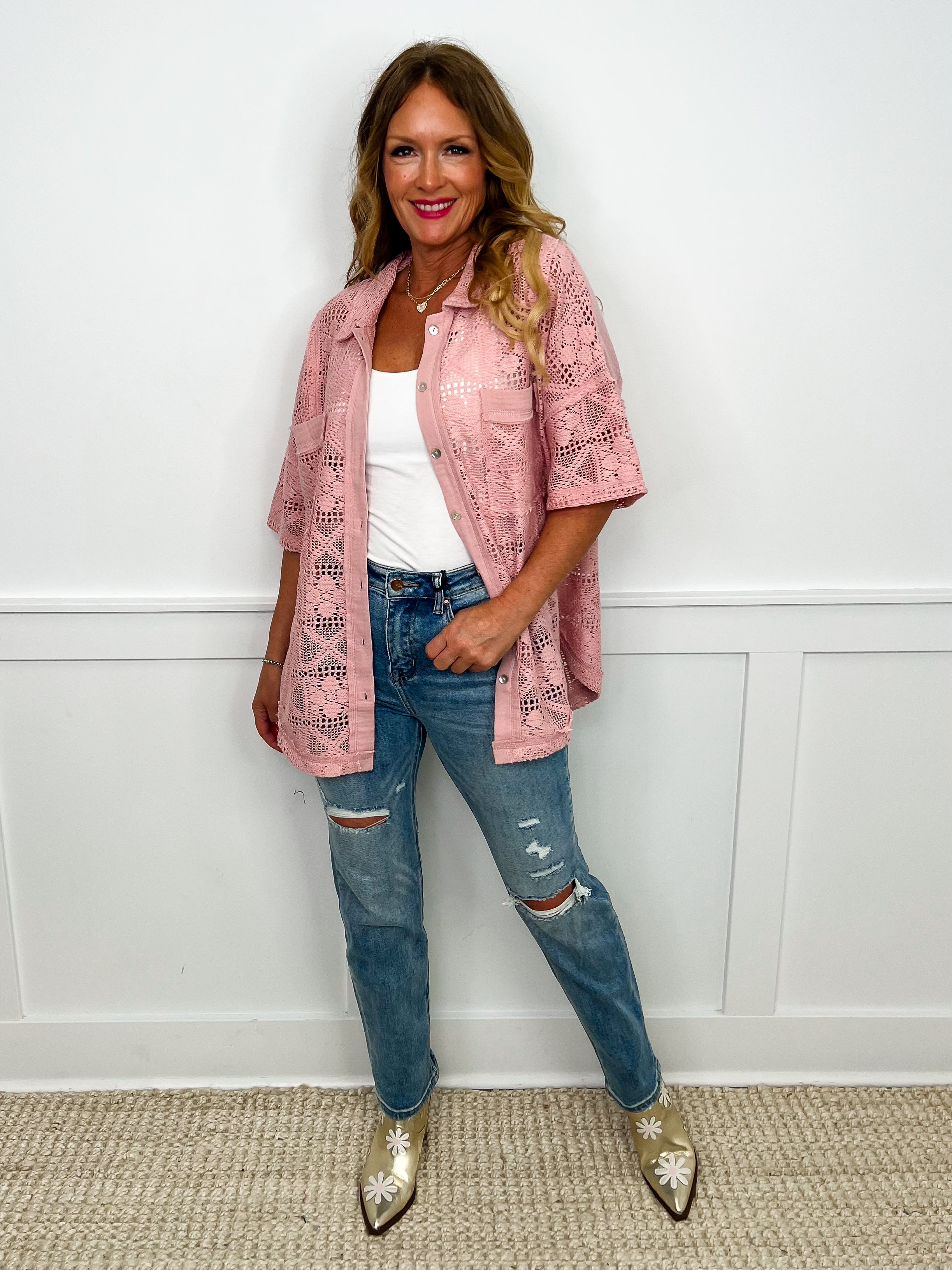 Drift into daydreams with our Just Imagining Cotton Top! Delicate crochet lace details add whimsical charm, while mother-of-pearl buttons catch the light with every movement. The light & airy fabric keeps you cool during sunny adventures. Available in two delightful colors, this button-up is your new favorite playmate for summer frolics!