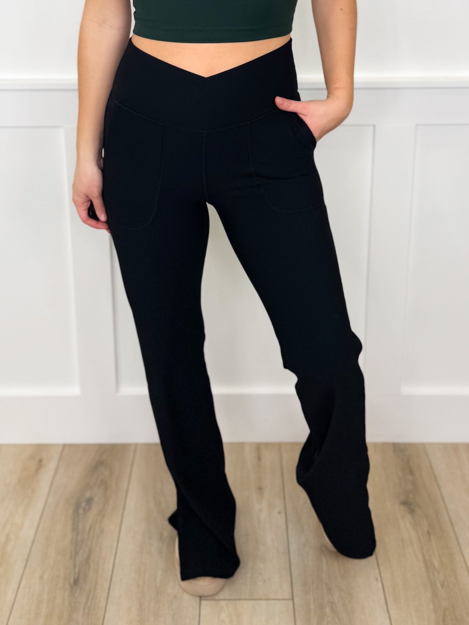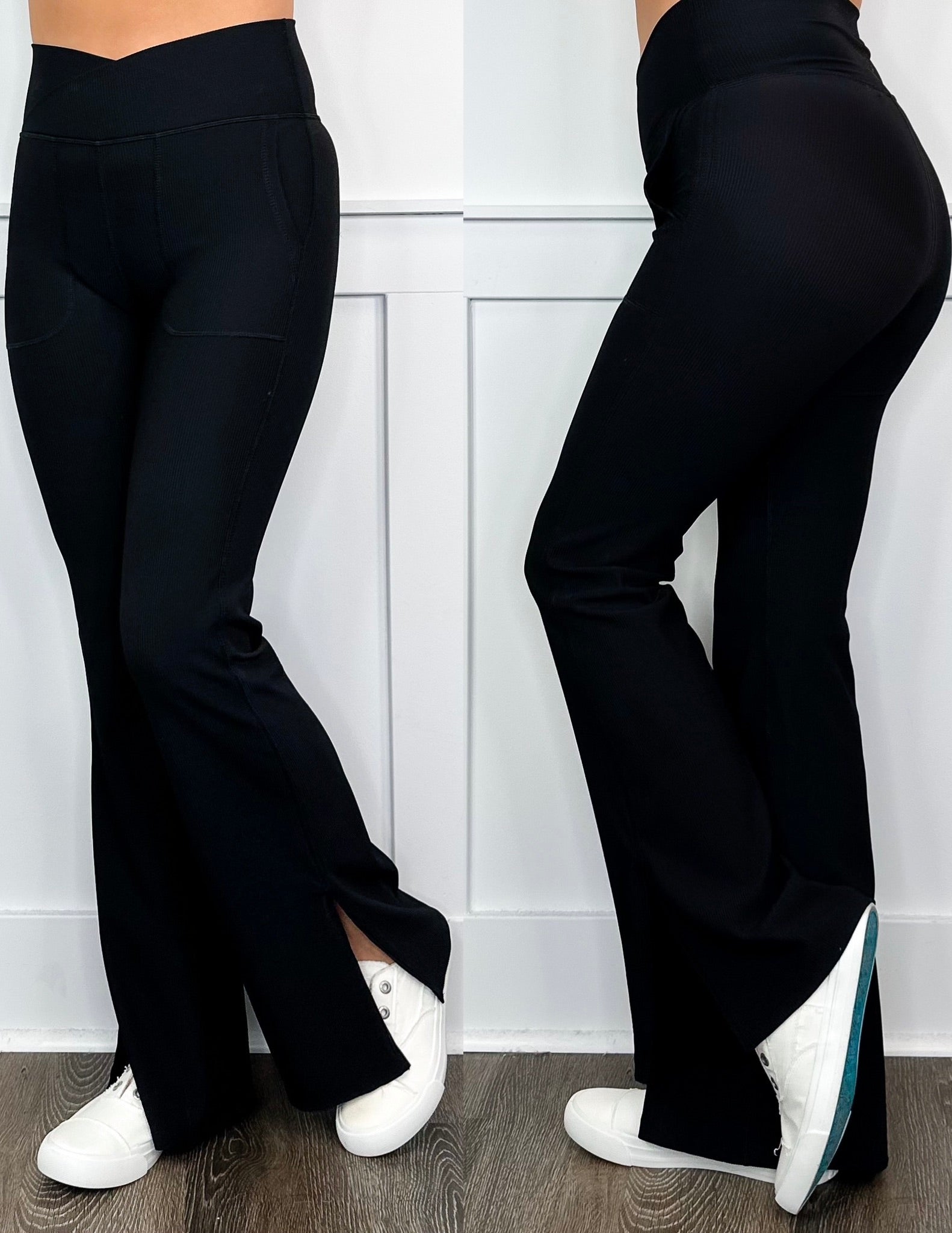 Elevate your workout game with our Push Through High Rise Ribbed Black Flare Yoga Pants. These trendy leggings not only add style to your outfit, but also provide the perfect fit and support for your active lifestyle. Take a risk and push through your limits in these bold and versatile pants.