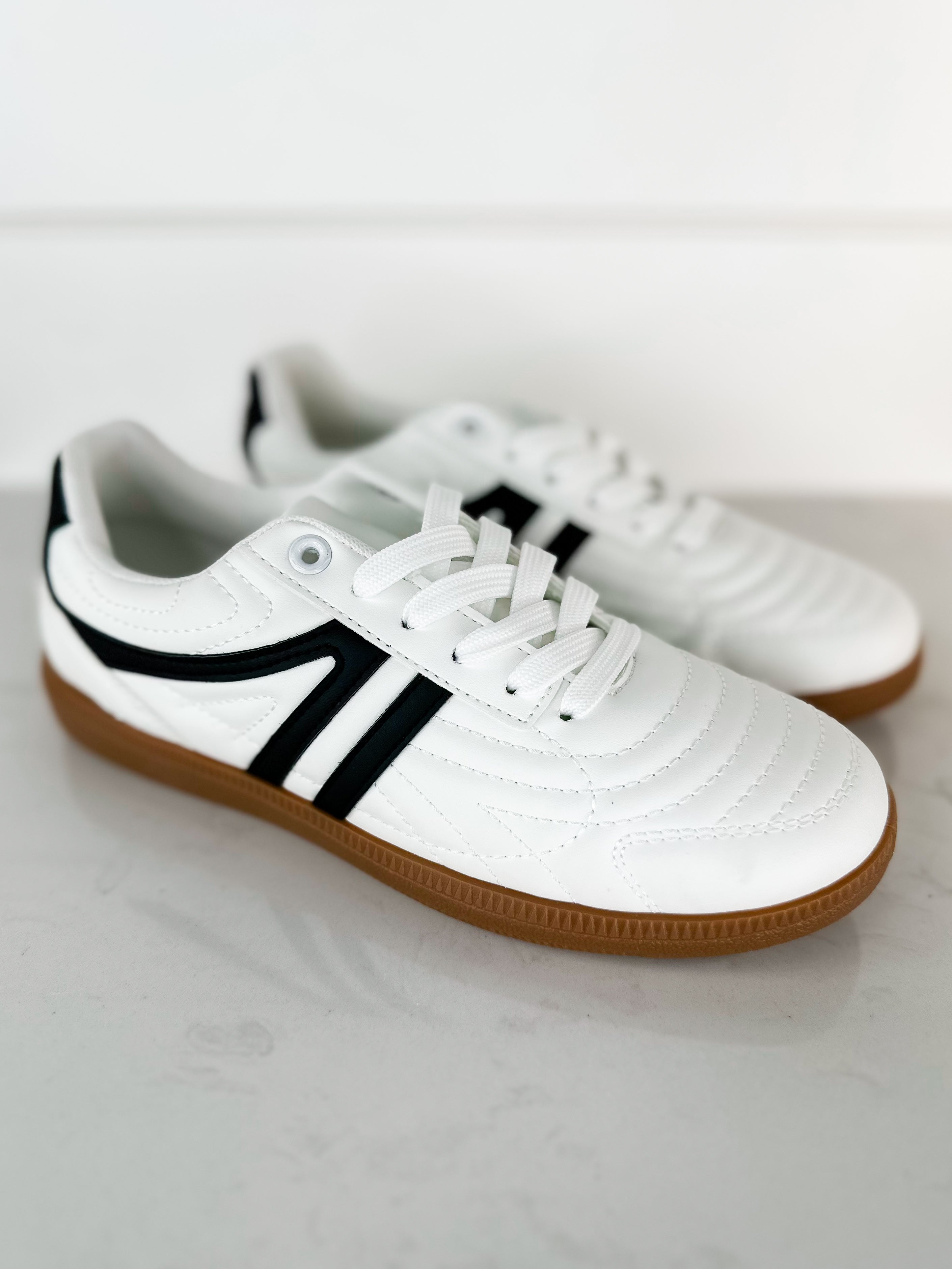 Upgrade your shoe game with our New Kicks New Me White Faux Leather Sneakers. Featuring a classic white design with a sleek black accent, these everyday go-to sneakers will give you a fresh new look. Time to kick up your style game!