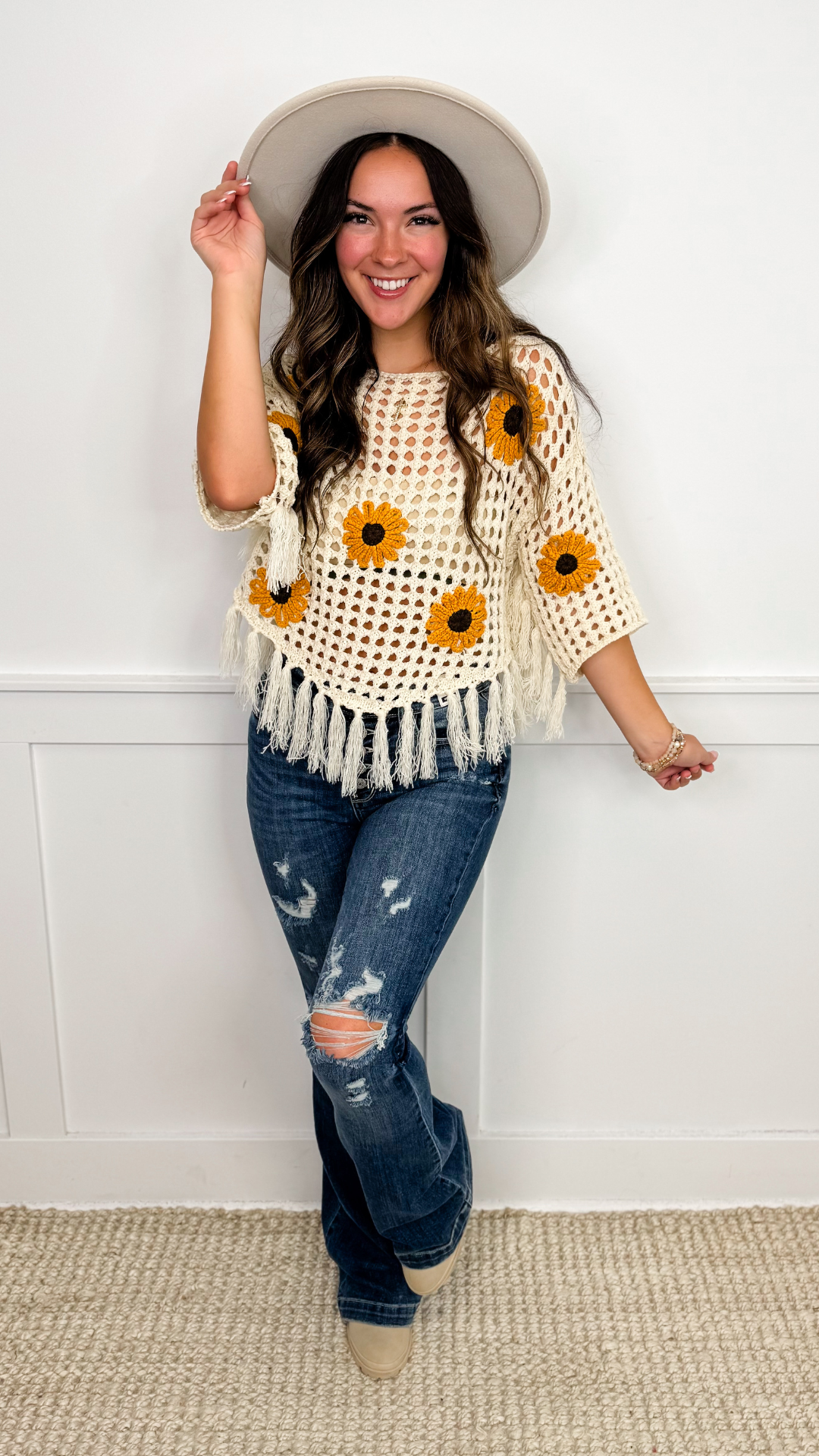 Stay stylish in the sun with our Pure Sun Knit Three Quarter Sleeve Sand Avery Mae Sweater Top. This sunflower knit top not only adds a playful touch to your outfit with its tassel fringe but also provides the perfect amount of coverage for those sunny days.