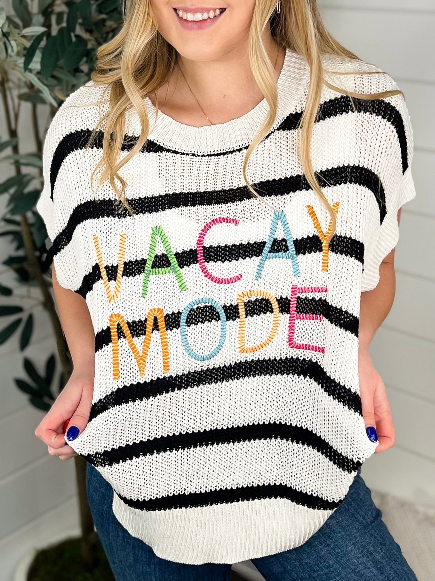 Get ready for vacation vibes with this black and white striped knit top. Featuring the fun phrase "Vacay Mode" in a variety of colors, this top is perfect for a day by the pool or a breezy day on a cruise. Don't forget to pack it for your next getaway!