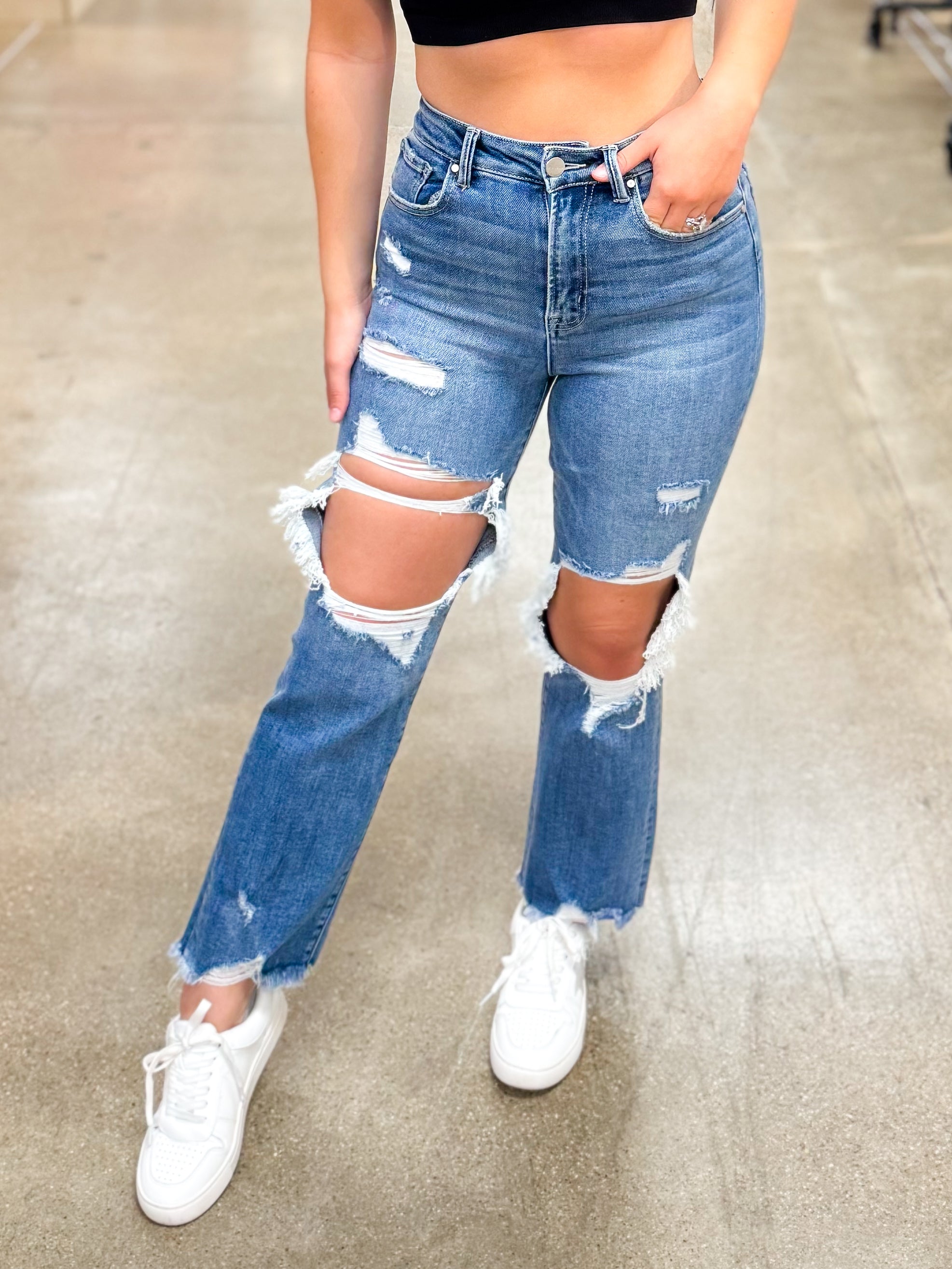 Risen Emma Distressed High Rise Fray Hem Cropped Straight Leg Medium Wash Blue Jeans