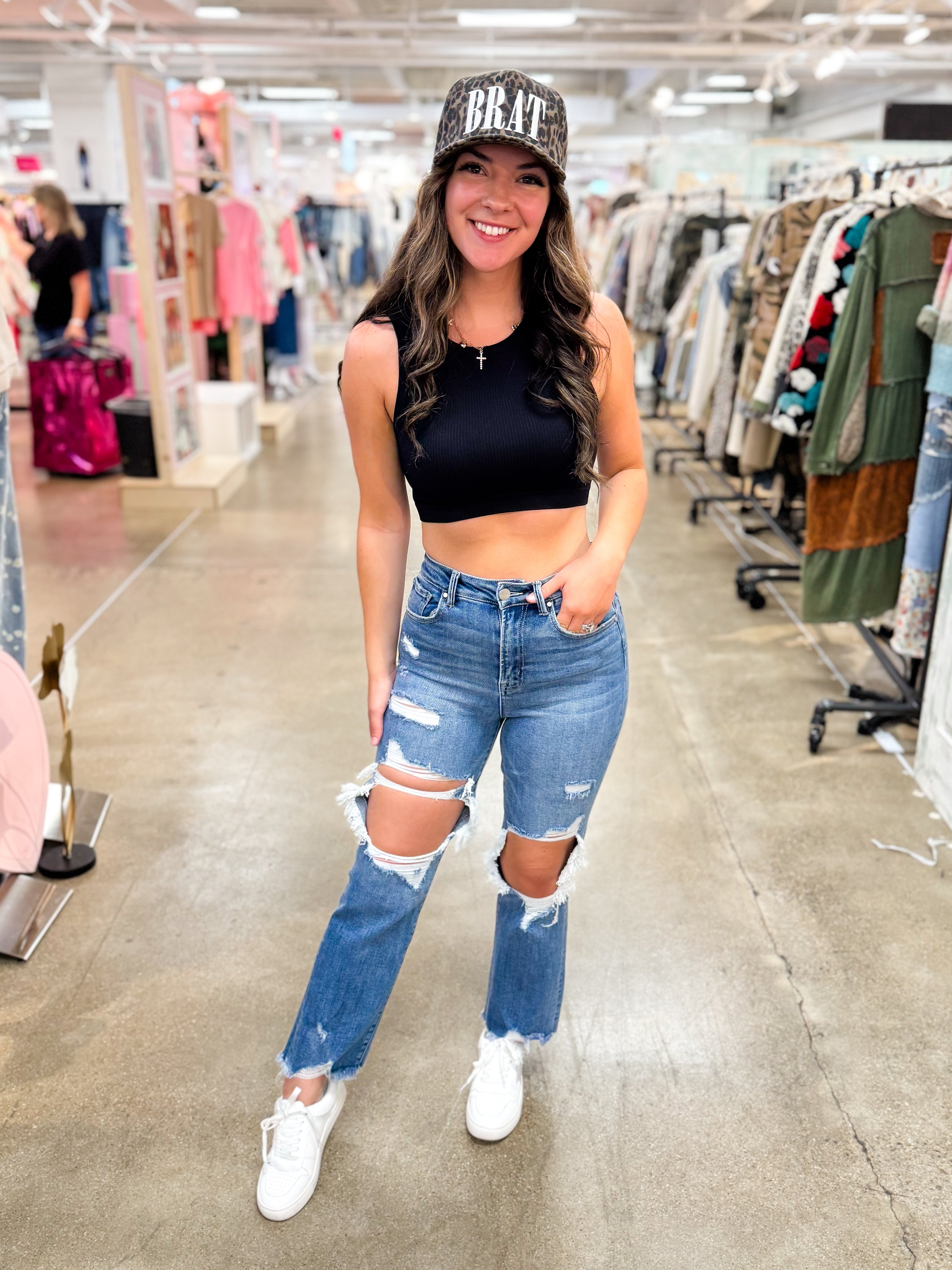 These medium wash blue jeans bring a playful edge with their distressed details and fray hem. The high-rise fit flatters your waist, while the cropped straight leg adds a trendy vibe. Crafted from very stretchy fabric, they move with you for all-day comfort and style. Perfect for mixing casual cool with a bit of attitude!