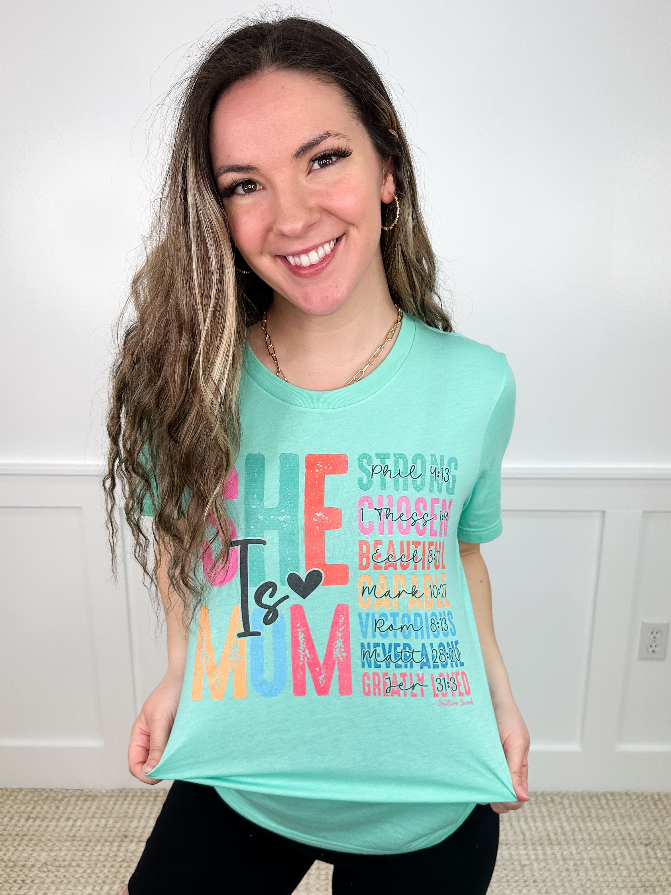 Be a proud mom in our She is All Things Tee, featuring soft cotton blend fabric and inspiring Bible verses. Because being a mom is everything, and so is this shirt!