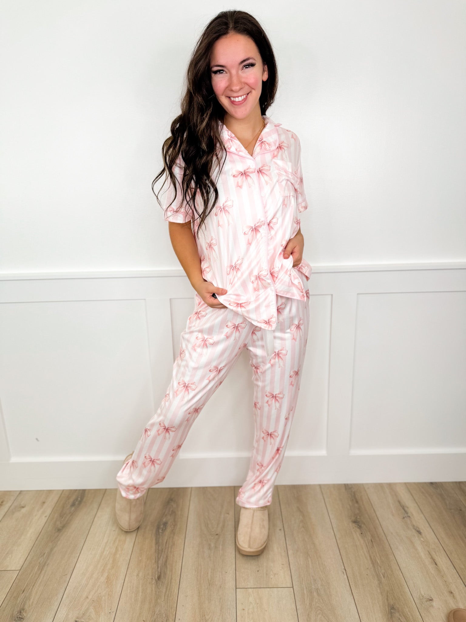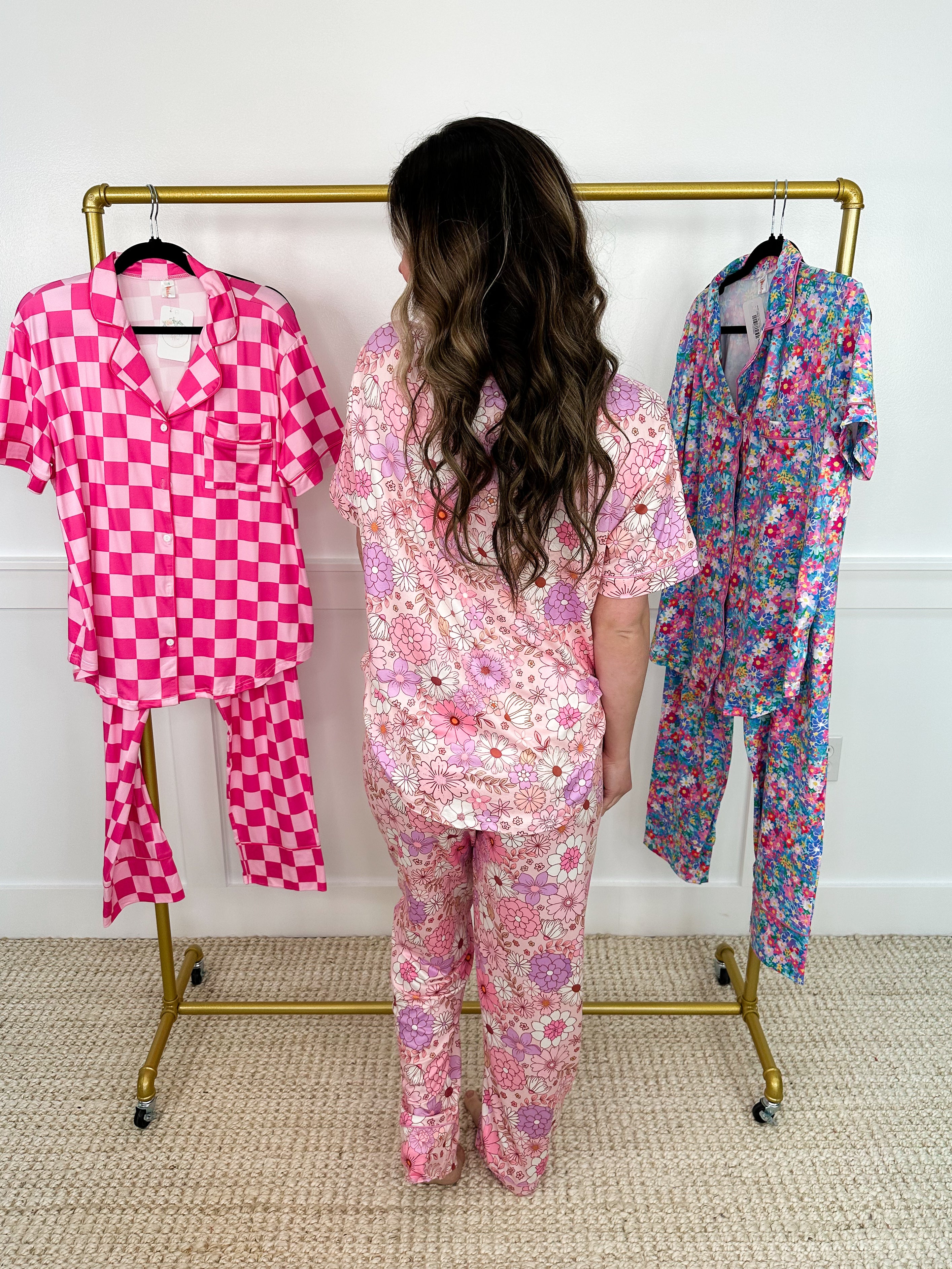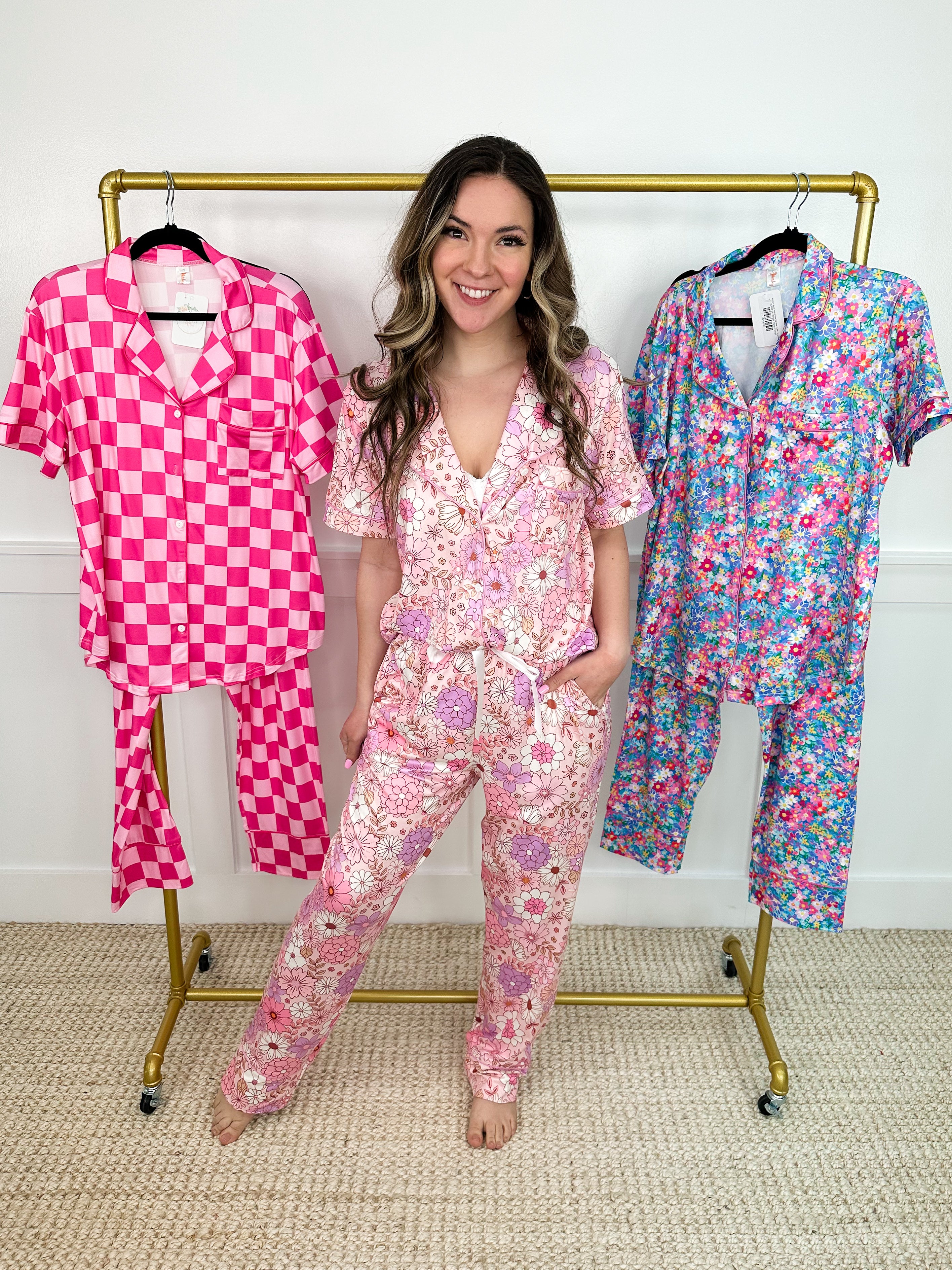 Unleash your inner comfort queen with Shirley & Stone's Unwind Time PJ Set! Choose from 3 cute patterns, perfect for lounging or sleeping. Featuring a short sleeve button up top and elastic pants with a drawstring for a customizable fit. Get ready to relax in style and comfort.