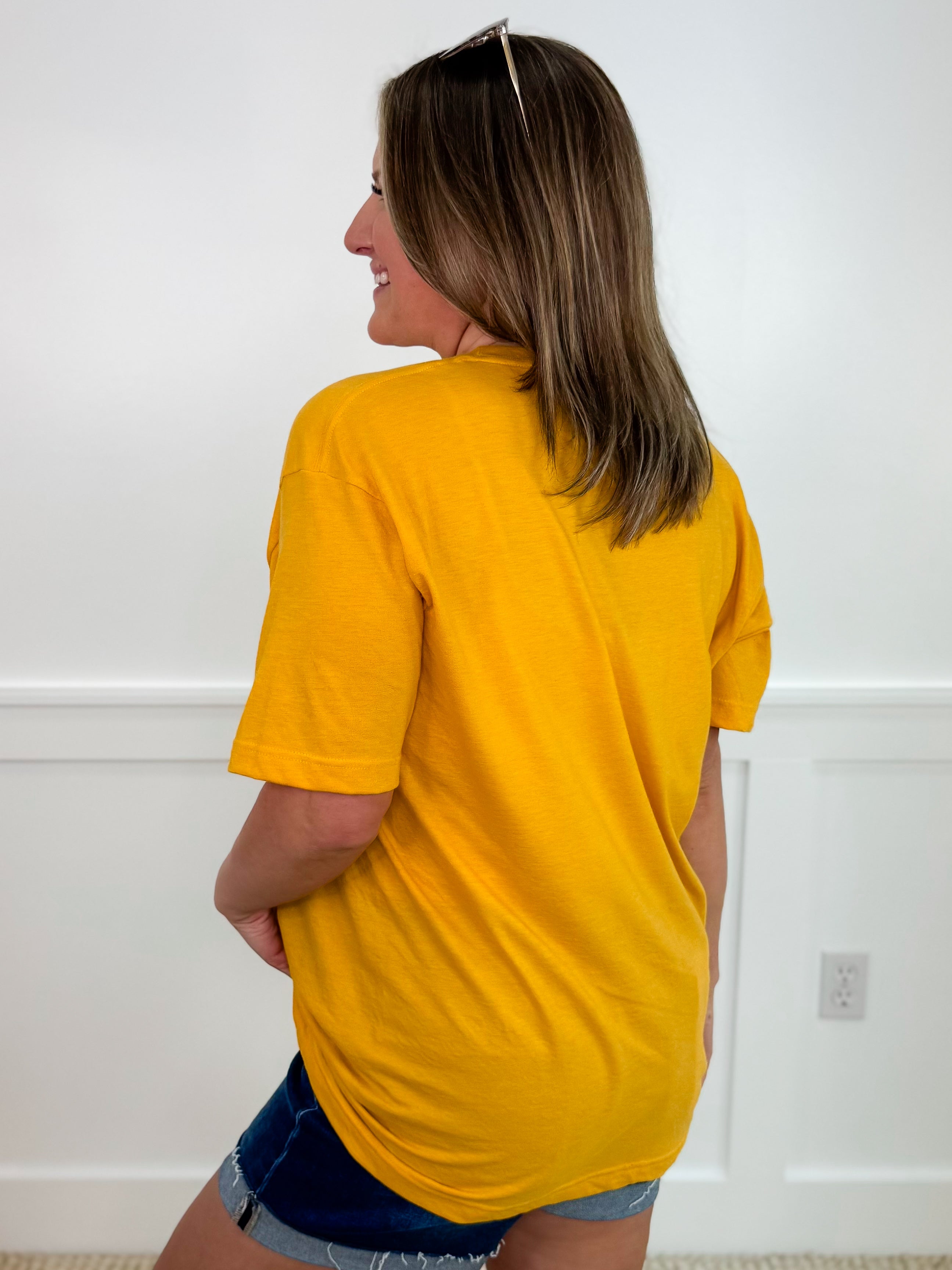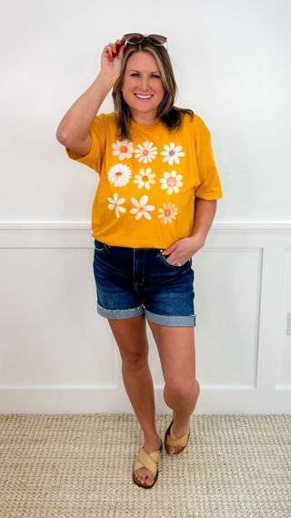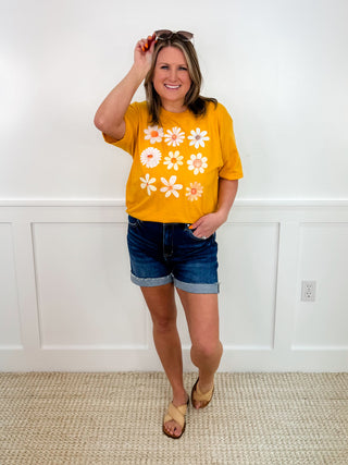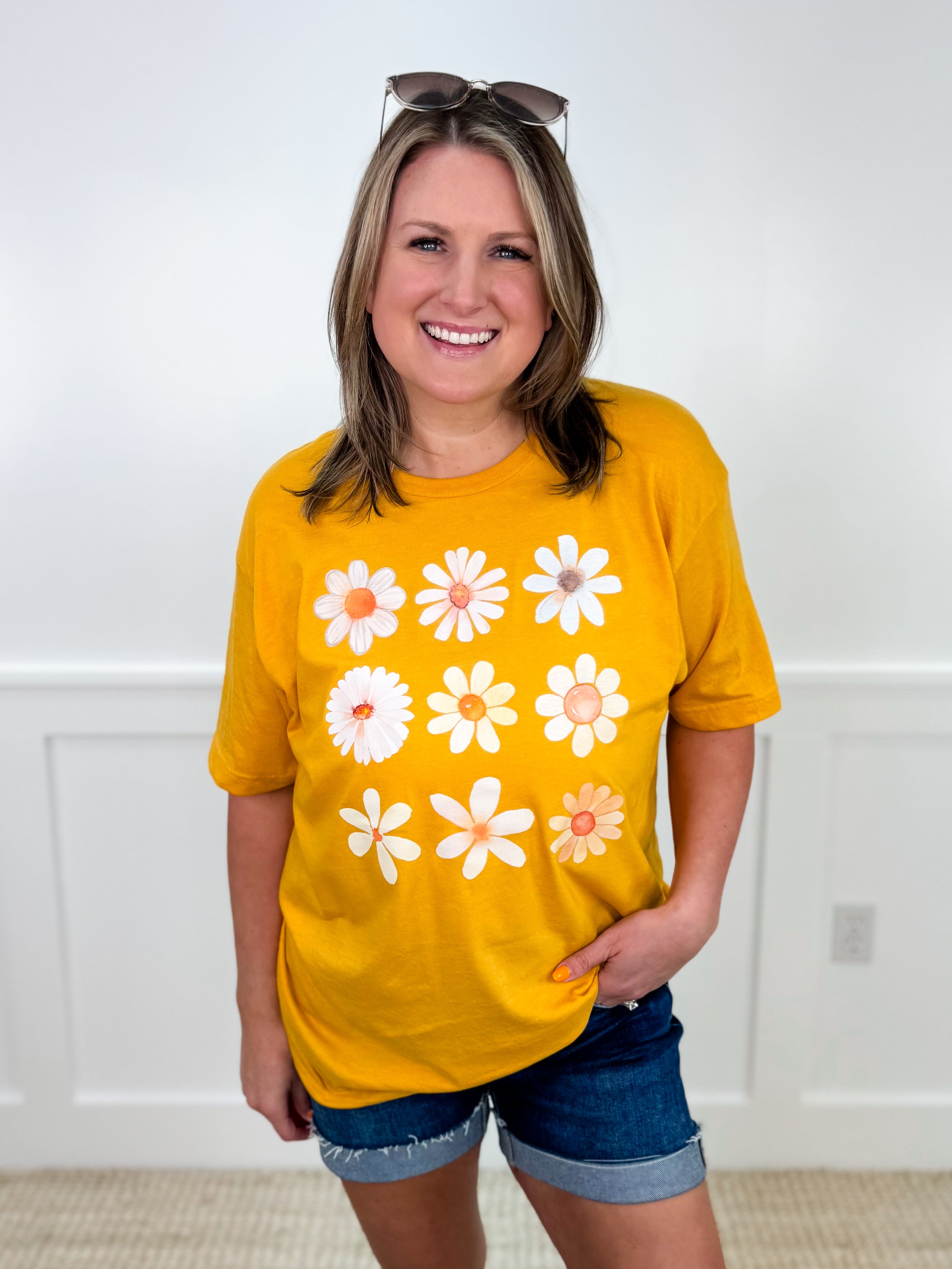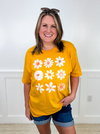 Let the sun shine in with our Sunshine Daisy graphic tee! Made with a soft and breathable cotton blend, this vibrant yellow shirt is perfect for summer days. Get yours now and spread some flower power!