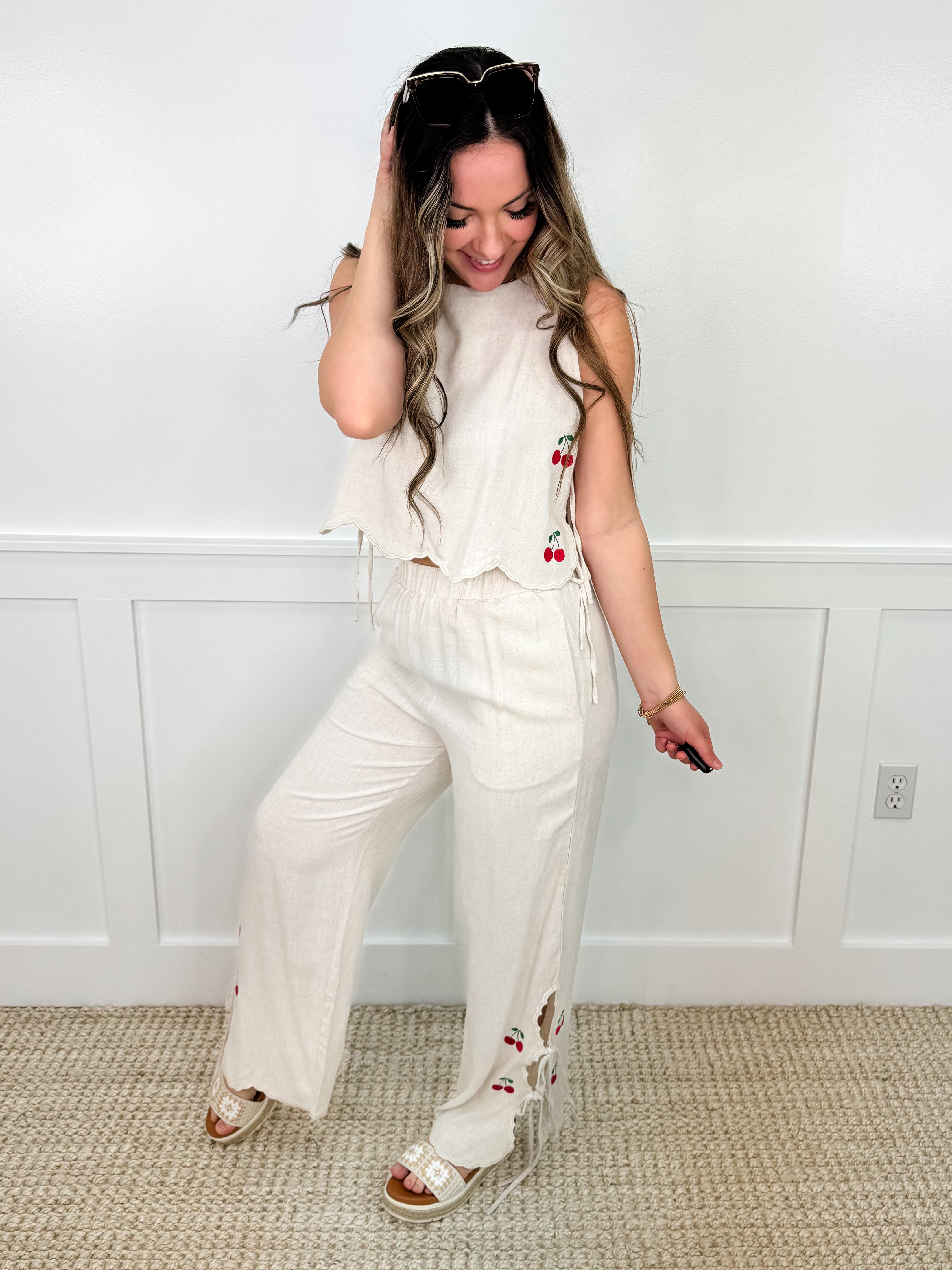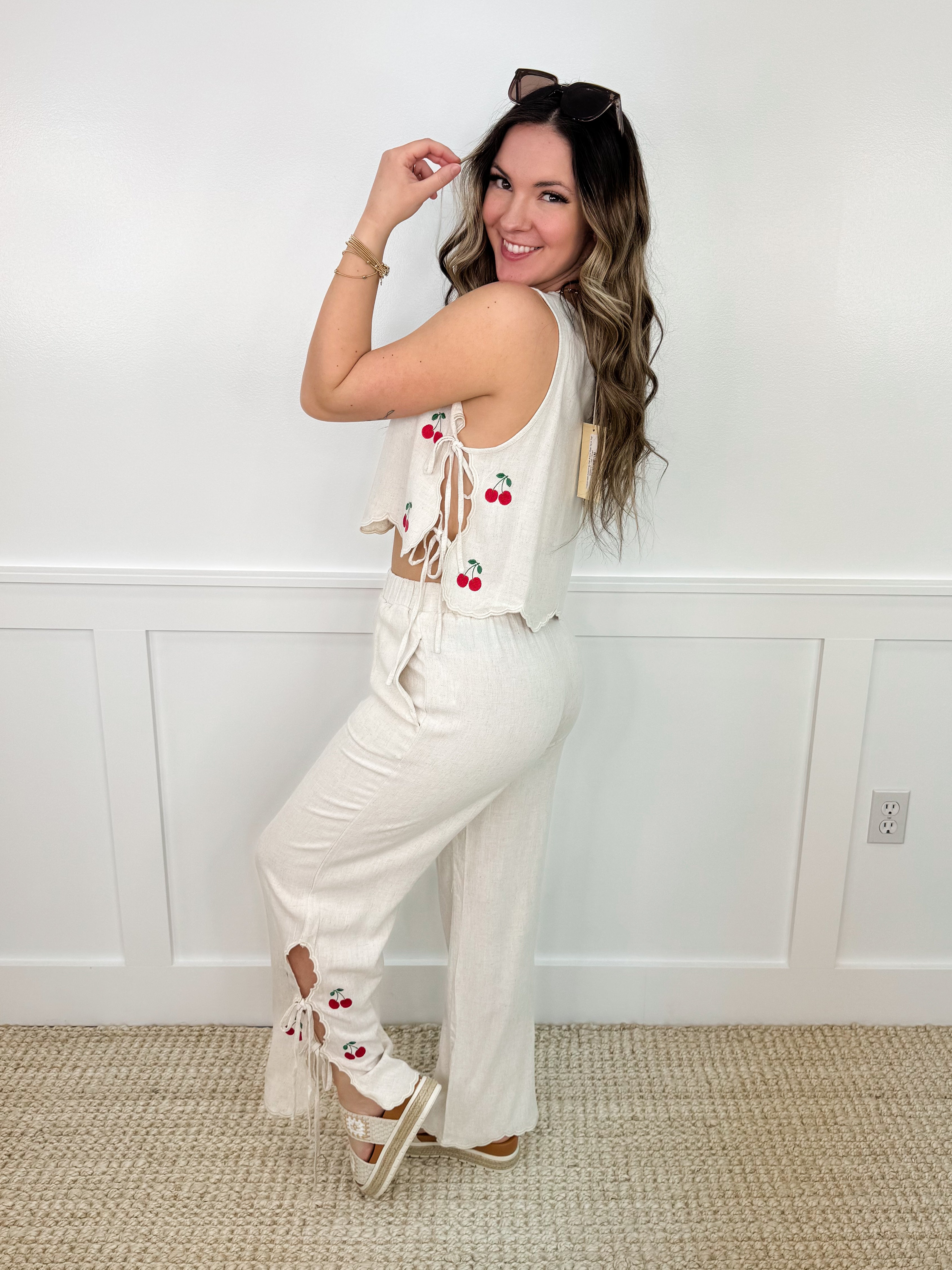 Get ready for Summer with our Sweetness Incoming High Rise Oat Avery Mae Bottoms! Featuring adorable ties and cutouts on the calves and embroidered cherries, these lightweight pants are the perfect addition to your wardrobe. (But seriously, they're so cute you'll want to wear them every day!)