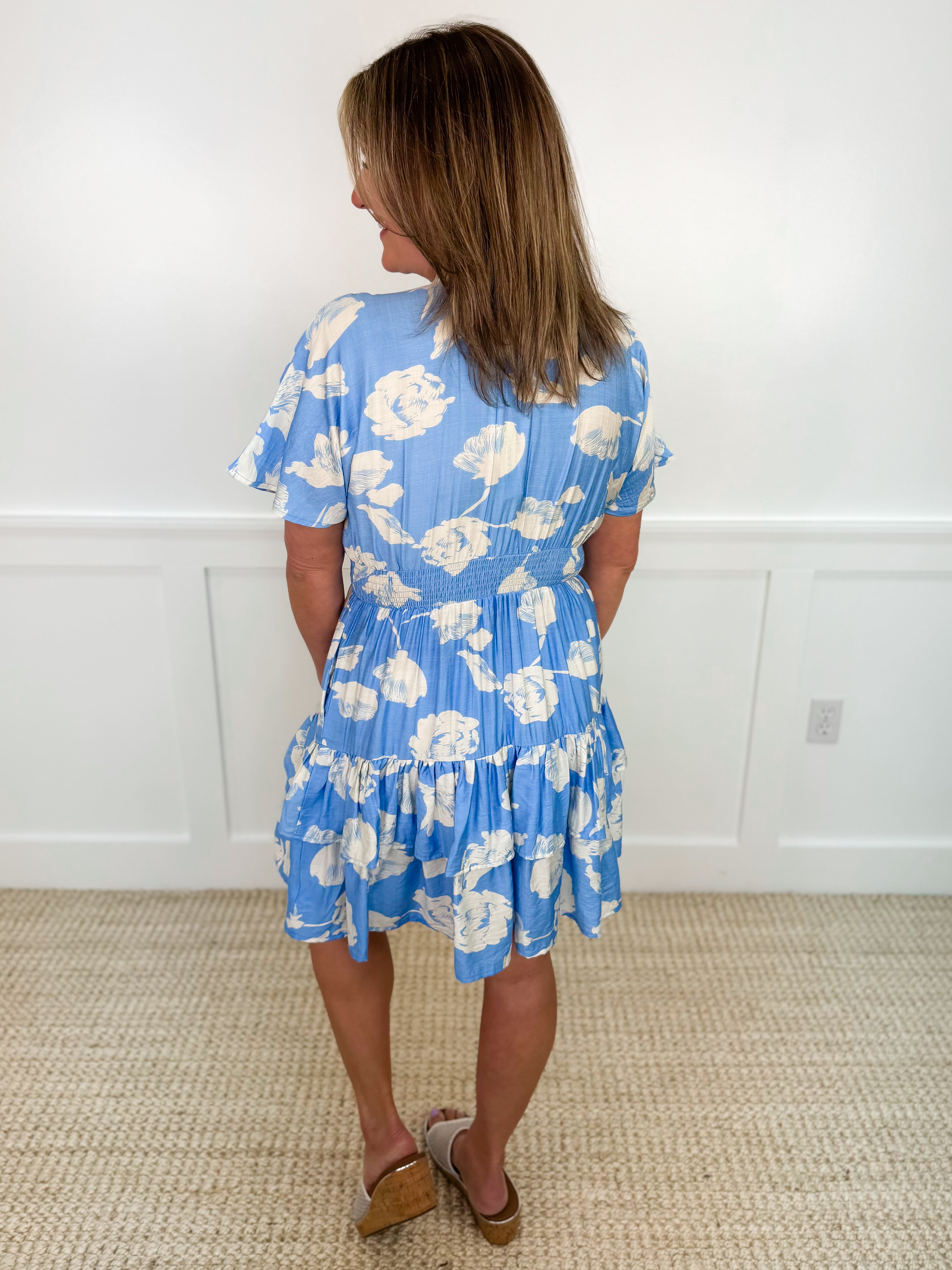 Indulge in effortless style with our Totally Devoted Lightweight Blue Avery Mae Dress! Featuring a stunning blue color with a delicate ivory floral design, short sleeves for comfort, and a smocked waistline and functional pockets for a flattering and practical touch. Embrace elegance and convenience with this must-have dress!