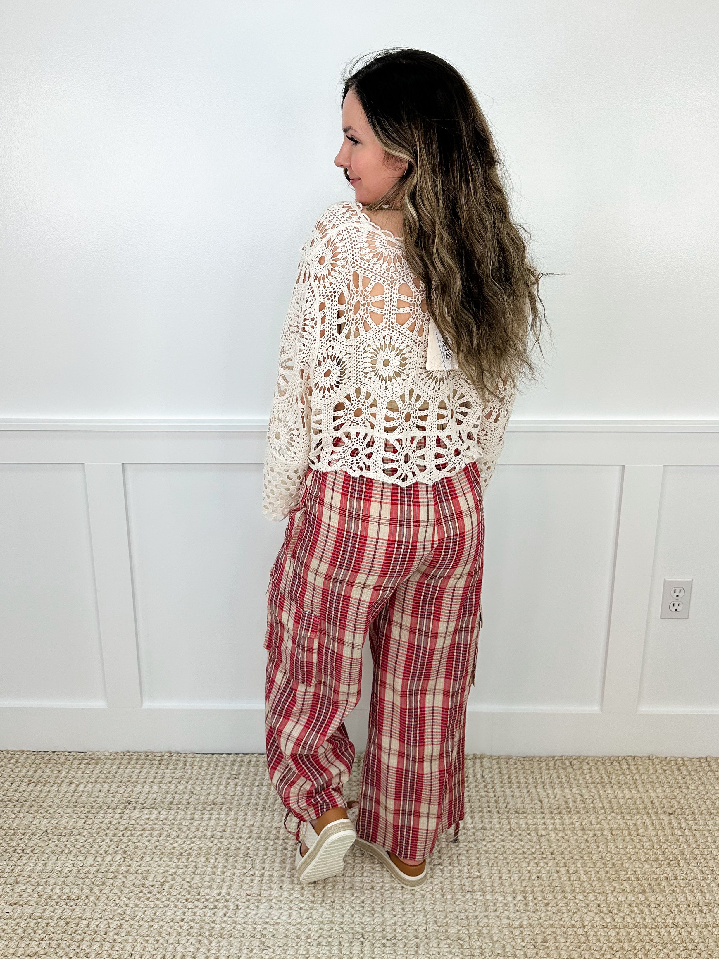 Elevate your style with our Truth be Told High Rise Cotton Blend Plaid Avery Mae Cargo Bottoms! The red and cream plaid, accented with hints of blue, adds a pop of color while the elastic waistband and drawstring provide a comfortable fit. Plus, the cargo pockets offer practicality without sacrificing style.