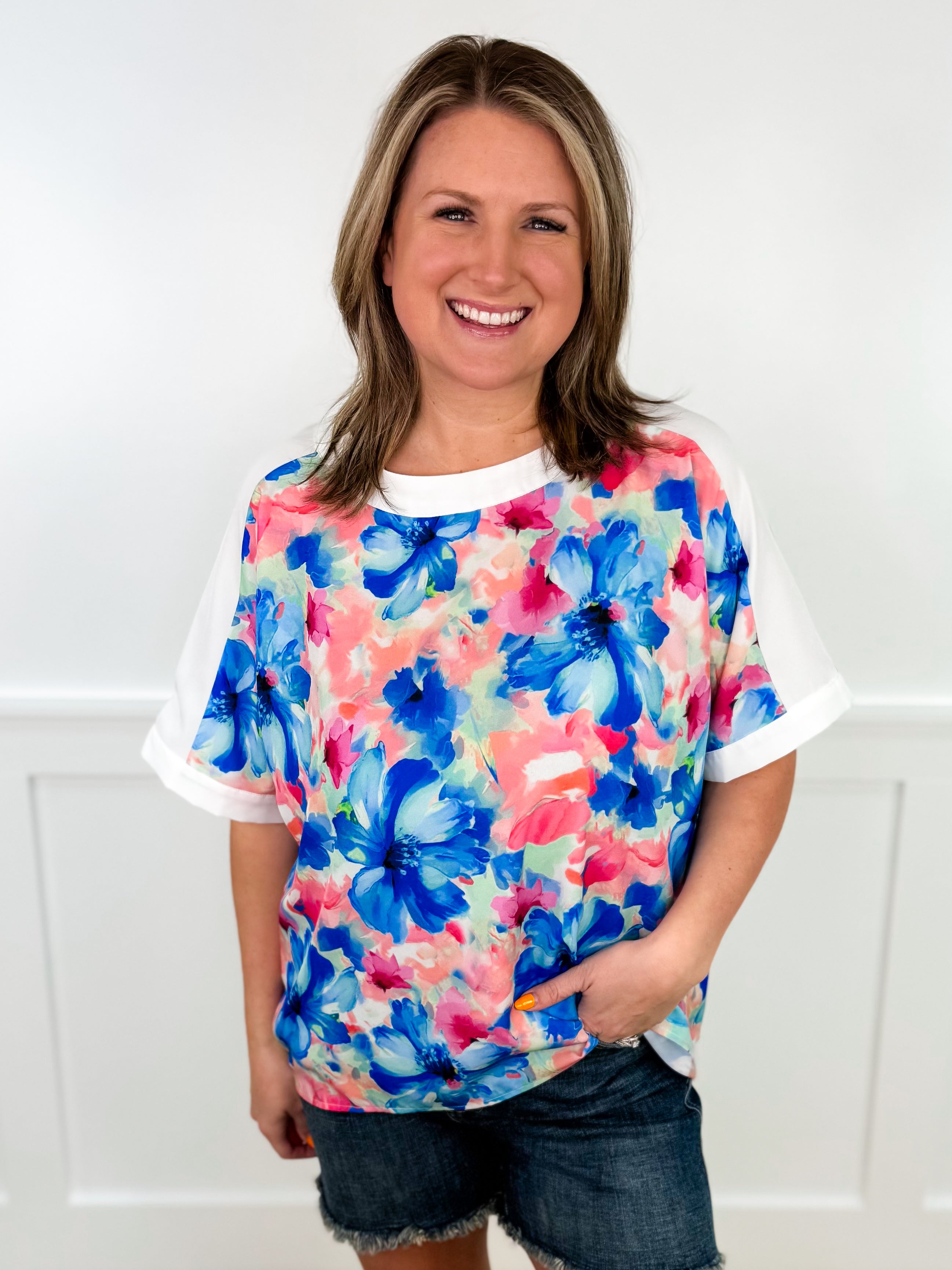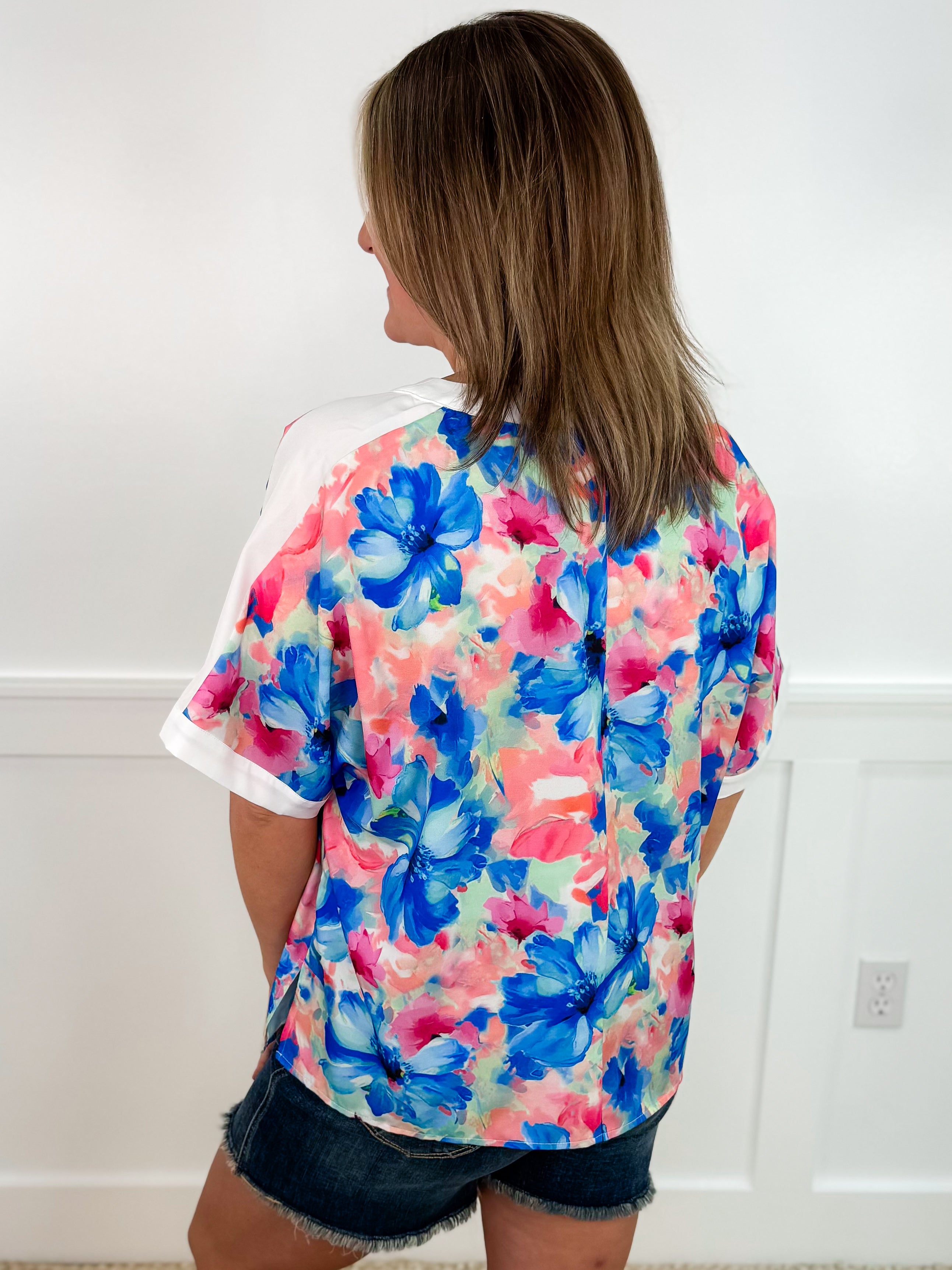 Introducing our World of Florals Avery Mae Top. Perfectly lightweight for the summer, this top also transitions seamlessly into the office when paired with dress pants. Its blue base is adorned with floral designs in pink, mint, and peach, making it a versatile and stylish addition to any wardrobe.