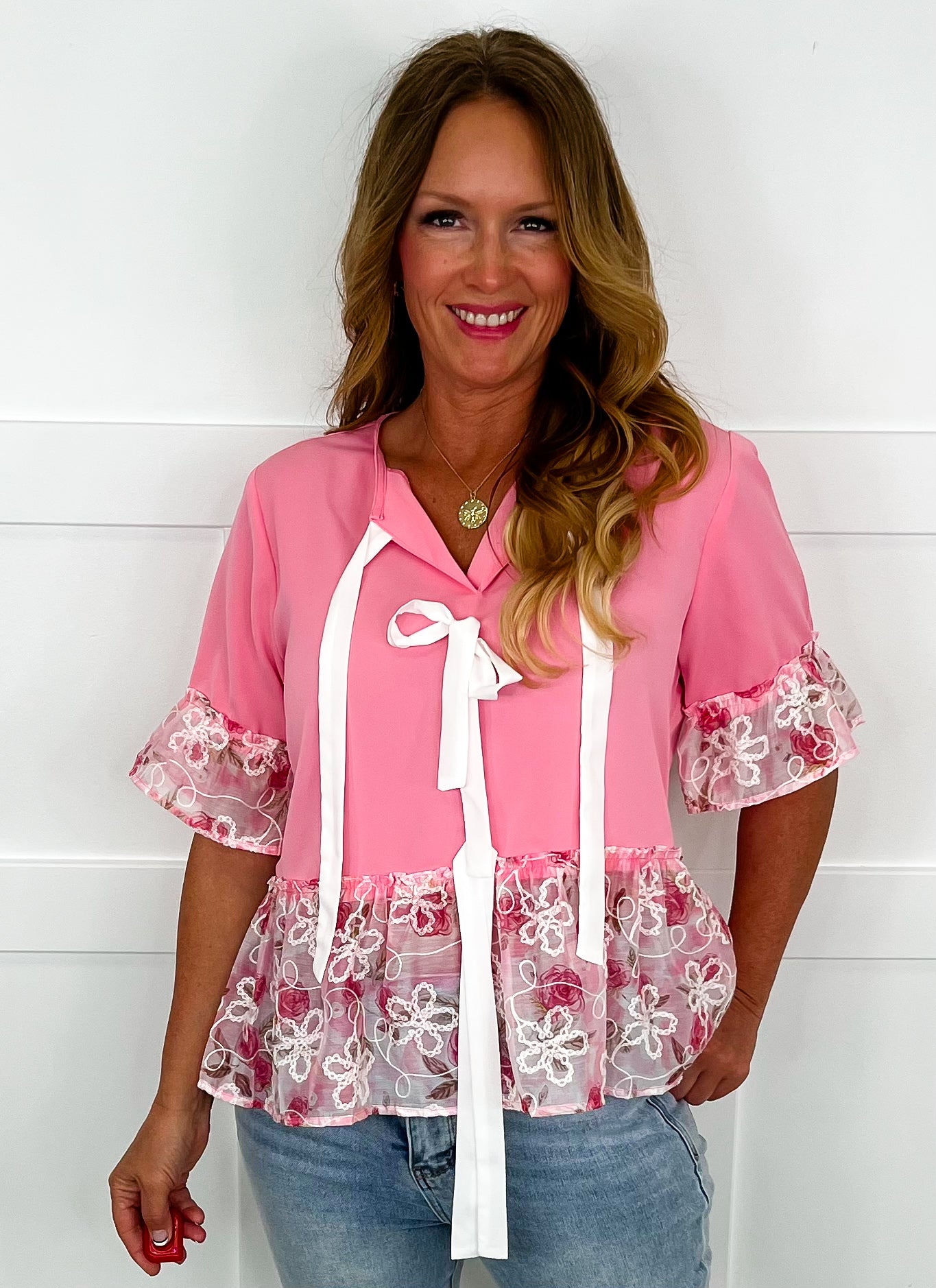 Elevate your style with our Rosy Outlook Pink Top! This playful piece features delicate sheer floral print ruffles adorning both the sleeves and hem, while three charming bows add a whimsical touch. Perfect for adding a feminine flair to your everyday wardrobe or dressing up for special occasions.