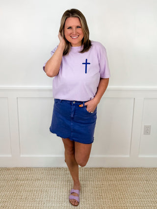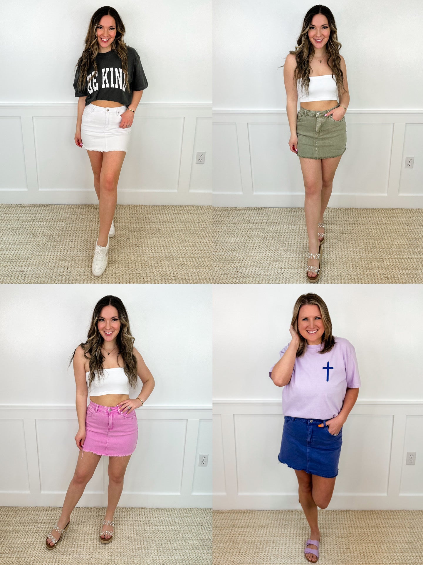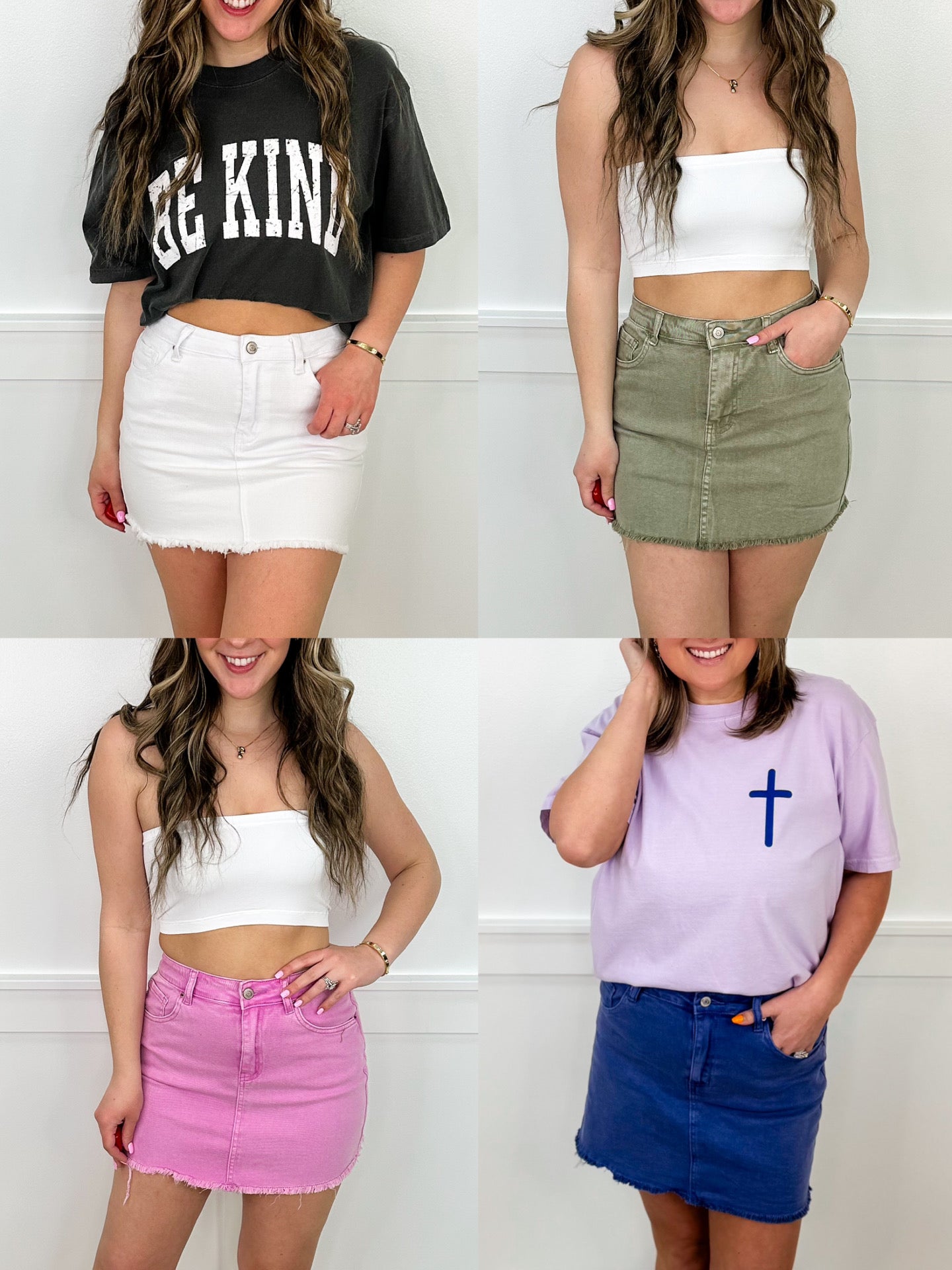 Experience comfort and style with our Zenana Dressing up High Rise Cotton Blend Denim Skirt! Choose from 4 beautiful colors and pair it with a flowy tank, double buckle sandals, a crossbody bag, and sunglasses for a chic shopping look!